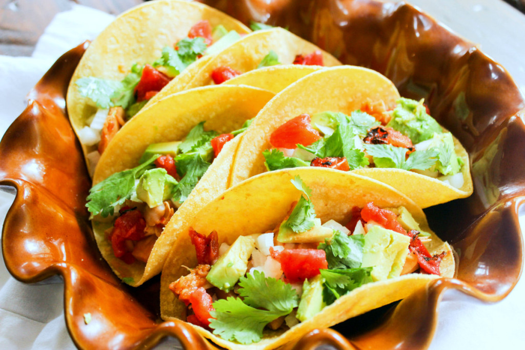 Assemble tacos with cooked jackfruit, diced avocado, diced onions, cliantro. Serve with salsa of choice and lime.